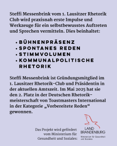 Steffi Messenbrink vom 1. Lausitzer Rhetorik Club wird praxisnah erste Impulse für ein selbstbewusstes Auftreten und Sprechen vermitteln. Von Bühnenpräsenz über das spontane Reden bis hin zum Stimmvolumen gibt der Workshops den Teilnehmenden erste Werkzeuge mit an die Hand und das alles mit einem Fokus auf kommunalpolitische Rhetorik und Situationen.