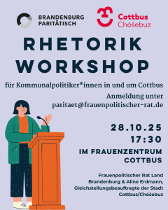 Am 28. Oktober laden der Frauenpolitische Rat Land Brandenburg e.V. und die Gleichstellungsbeauftragte der Stadt Cottbus, Aline Erdmann zu einem Rhetorik Workshop für Kommunalpolitiker*innen ein:
