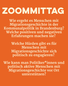 Das Thema des 4. Zoommittag ist die Teilhabe von Menschen mit Migrationsgeschichte in der Kommunalpolitik in Brandenburg.